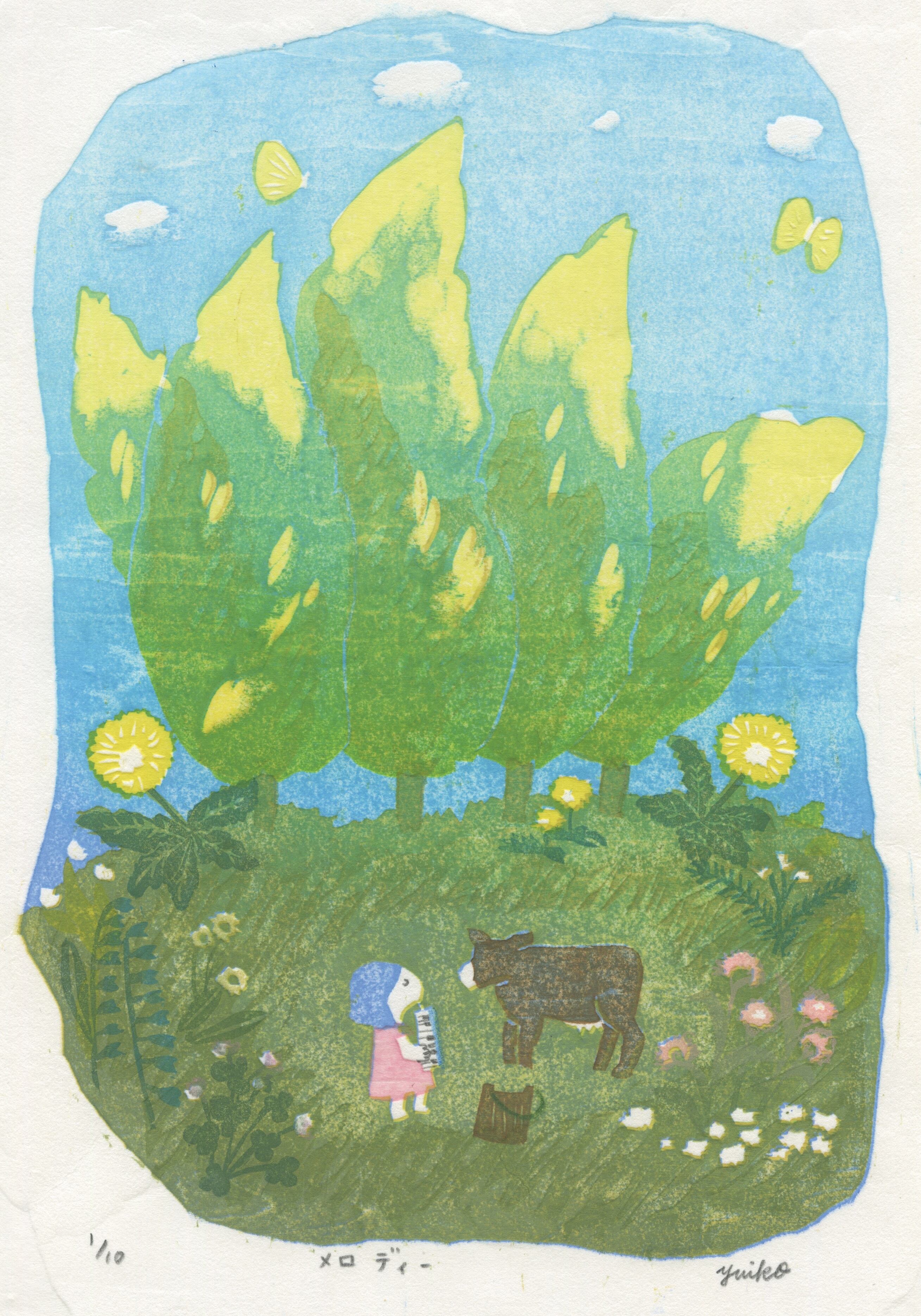 水性多色刷り木版画です。和紙に一枚一枚丁寧に手刷りで仕上げています。たった一つのアートを通じて、心温まるひとときをお楽しみください。エディション入りで、特別なコレクションにぴったりです。