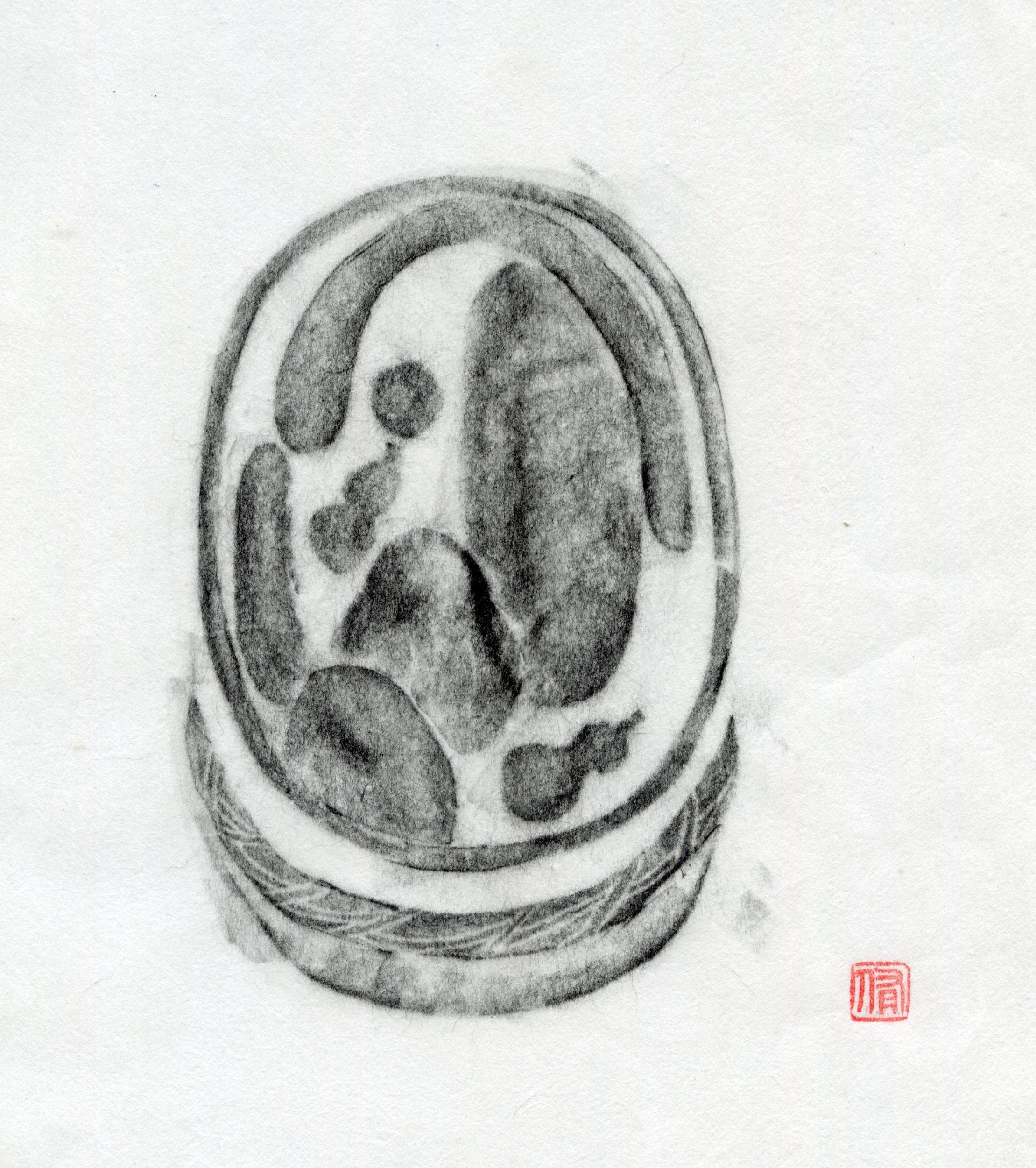 樽入りの奈良漬を版画にしてみました。瓜、胡瓜、瓢箪、西瓜が詰め込まれた様子。この作品は、厚紙で作った版を鉛筆で和紙にフロッタージュしたものです。