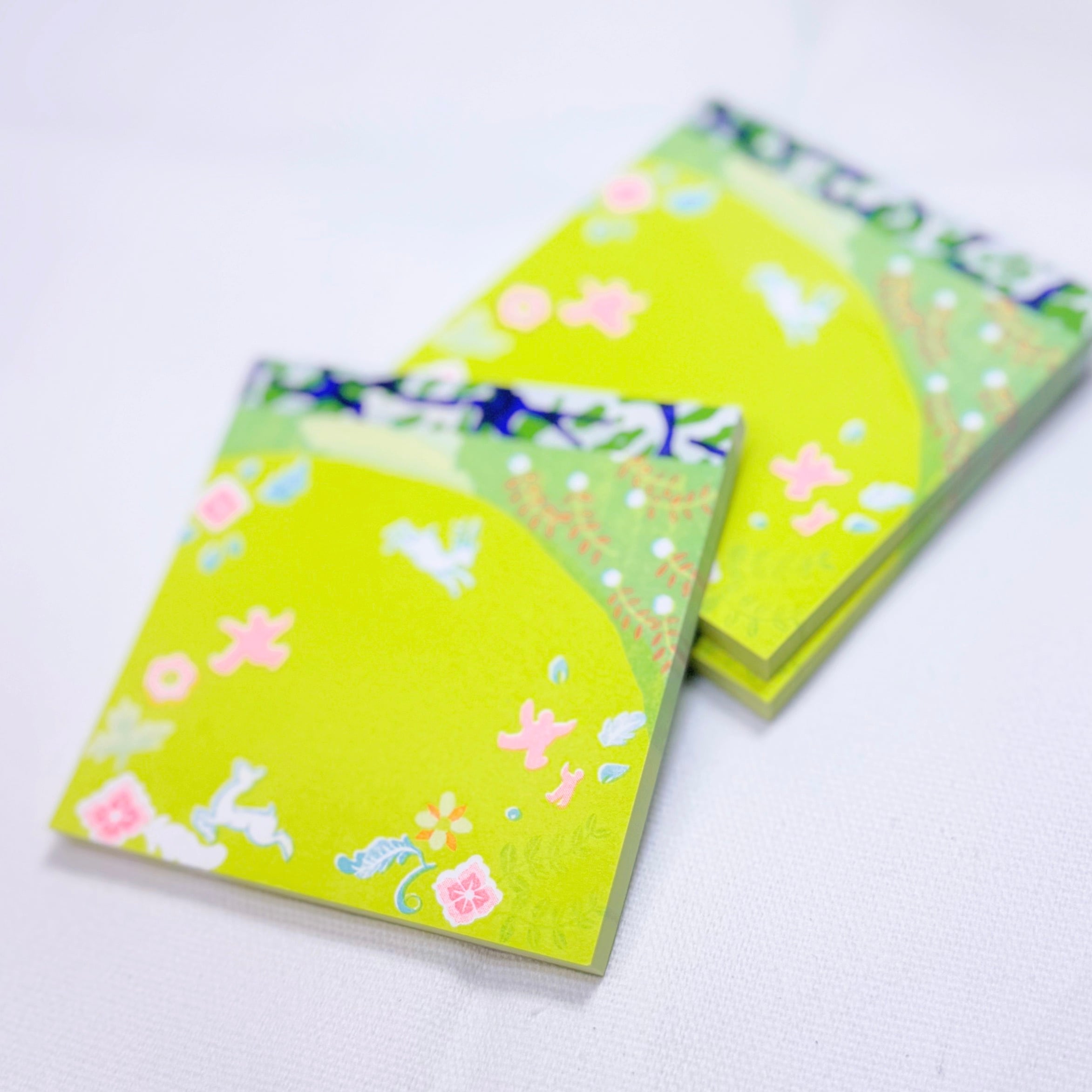 リソグラフで印刷したメモパッドです。目の覚めるような若草色の鮮やかな表面。楽しげに駆け回る鹿と子供達の周りに天平紋様をあしらいました。裏面にメッセージを書くなどご使用ください。全ページ同じ柄です。 サイズ:8cm×8cm 枚数:50枚