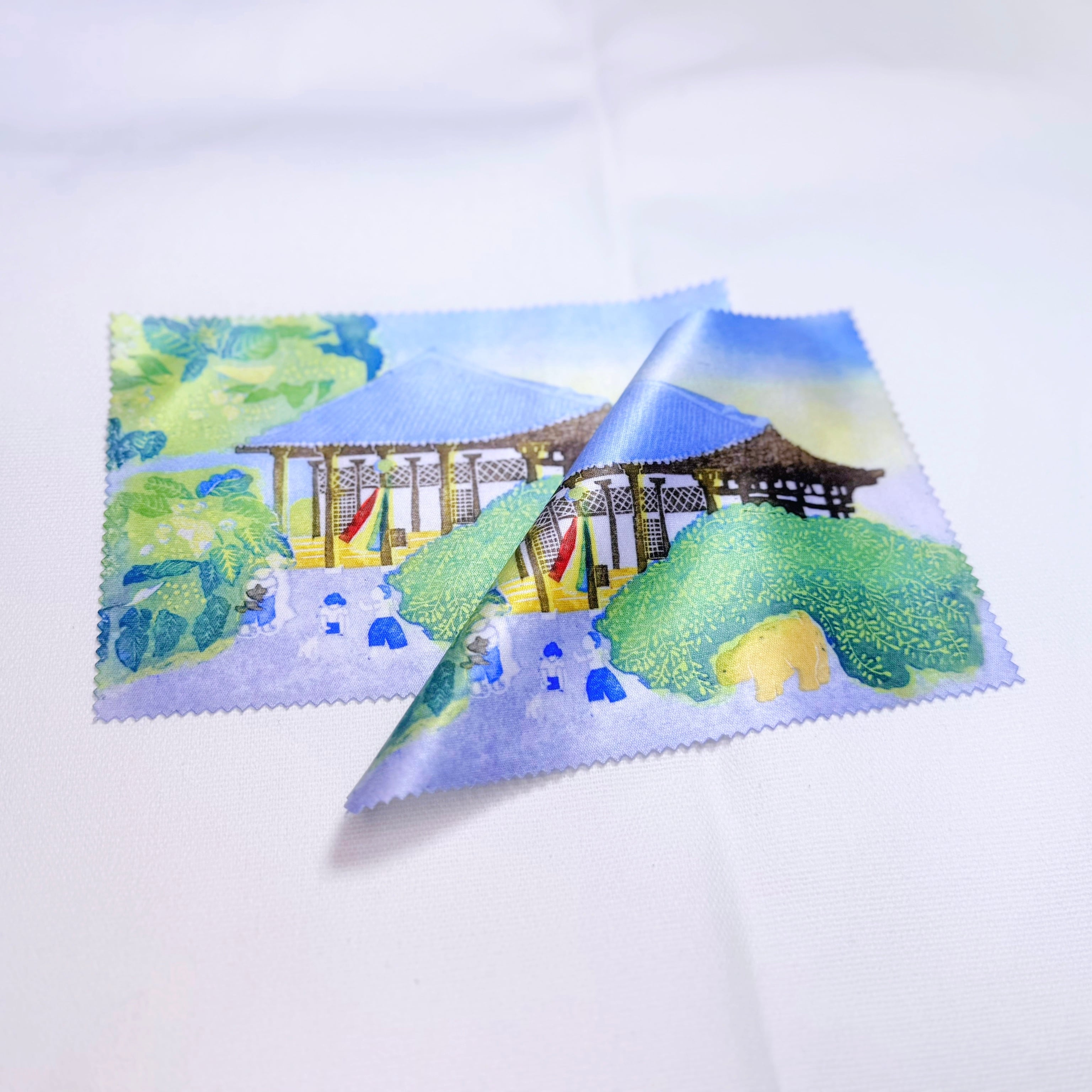 木版画「幼き日の元興寺」が使いやすいクロスクリーナーになりました。メガネ・スマホの画面・カメラ・ジュエリー・楽器など油脂やホコリを除去するのに使います。 サイズ:10cm×15cm 材質:ポリエステル 80% ナイロン 20%