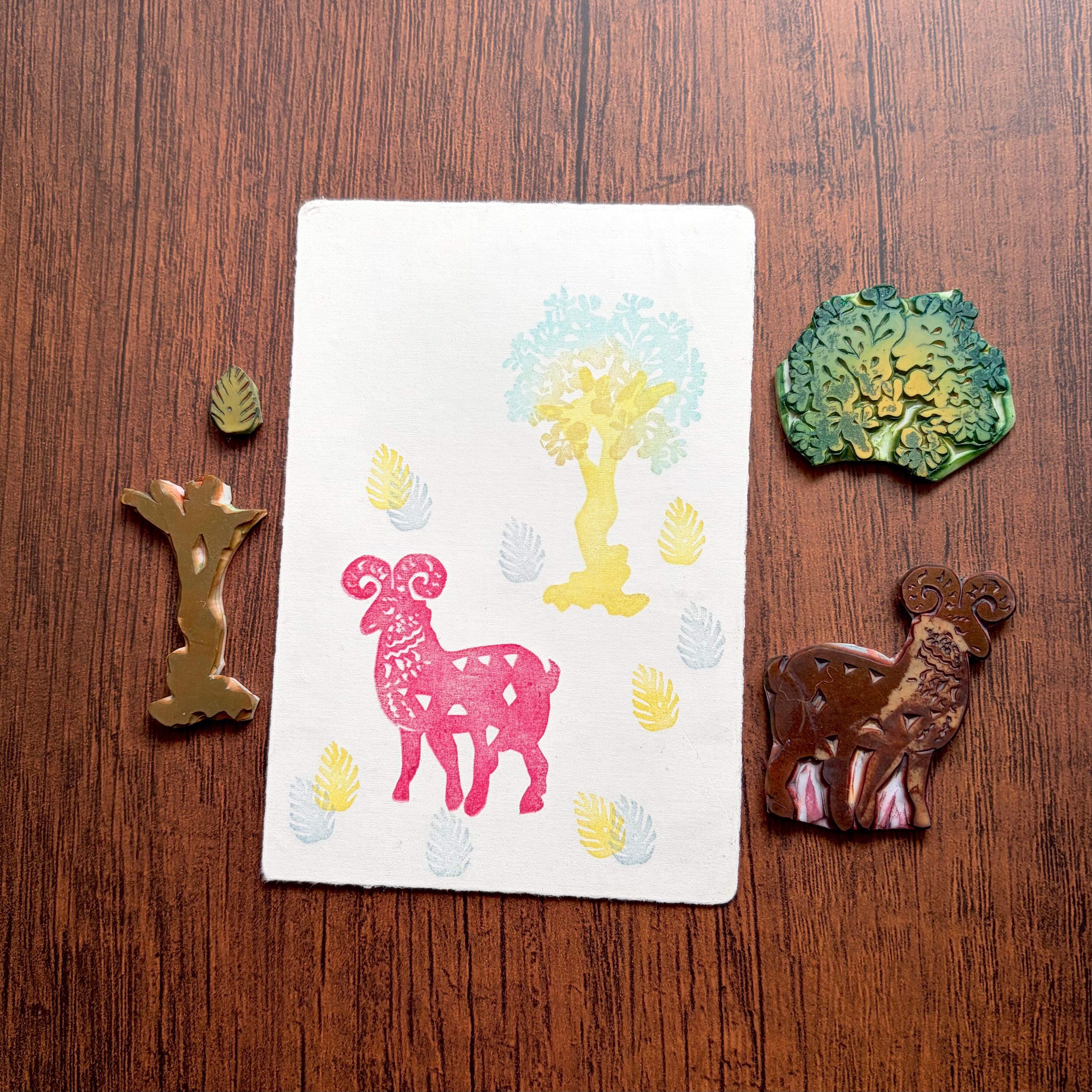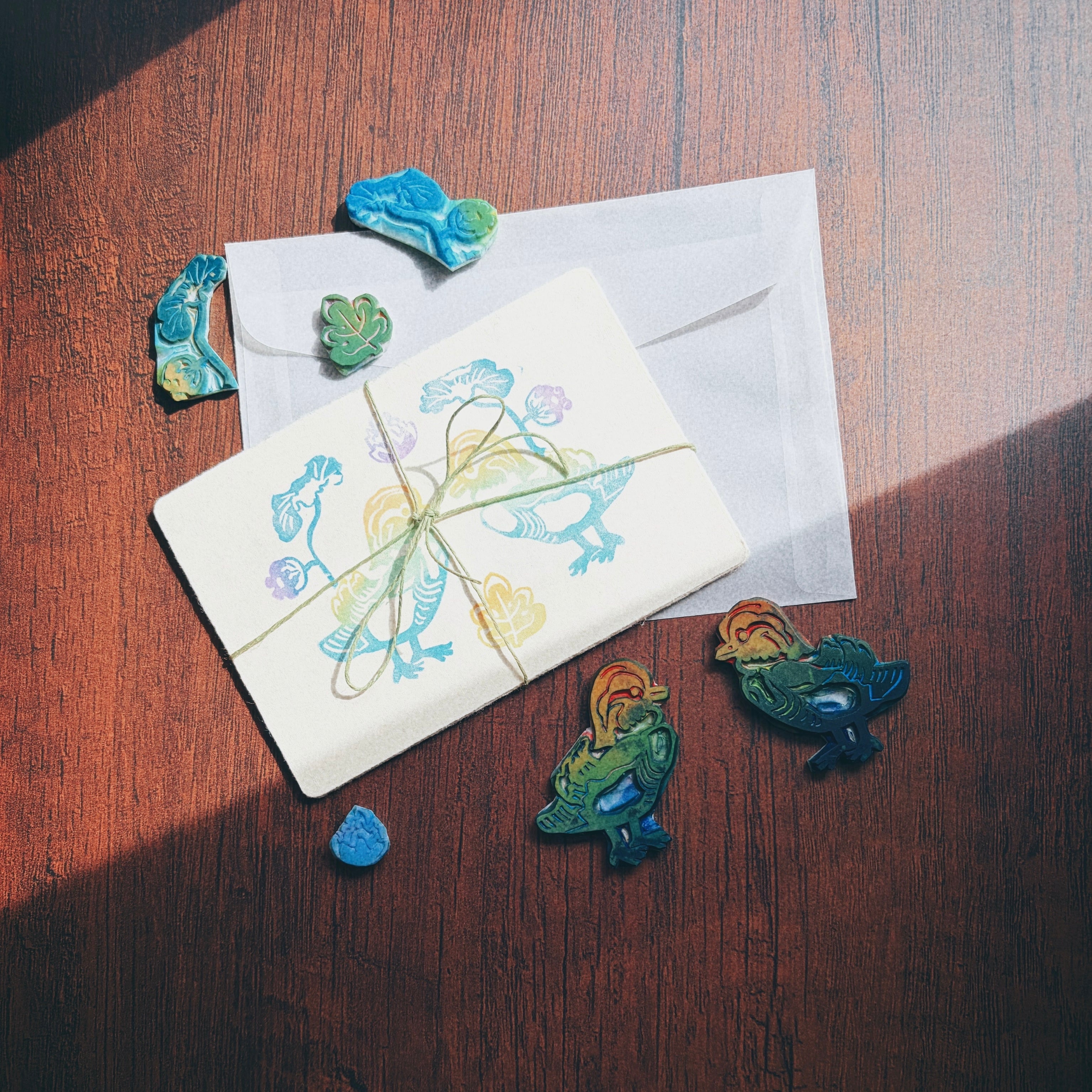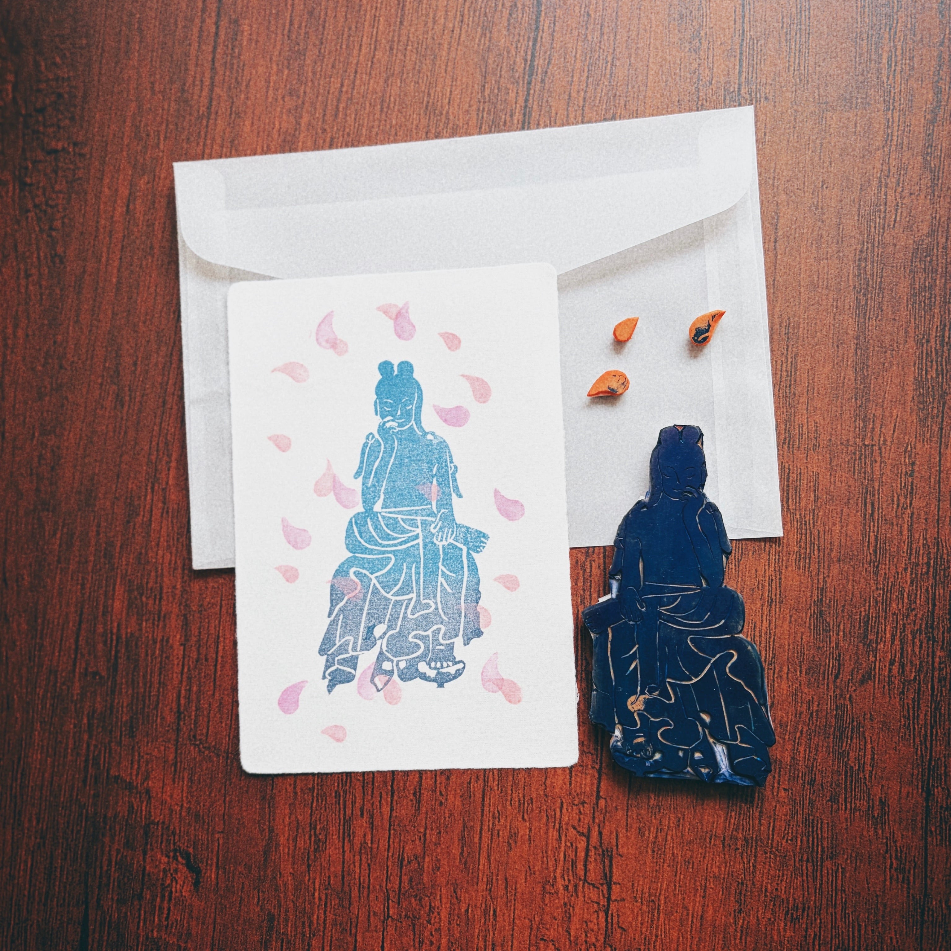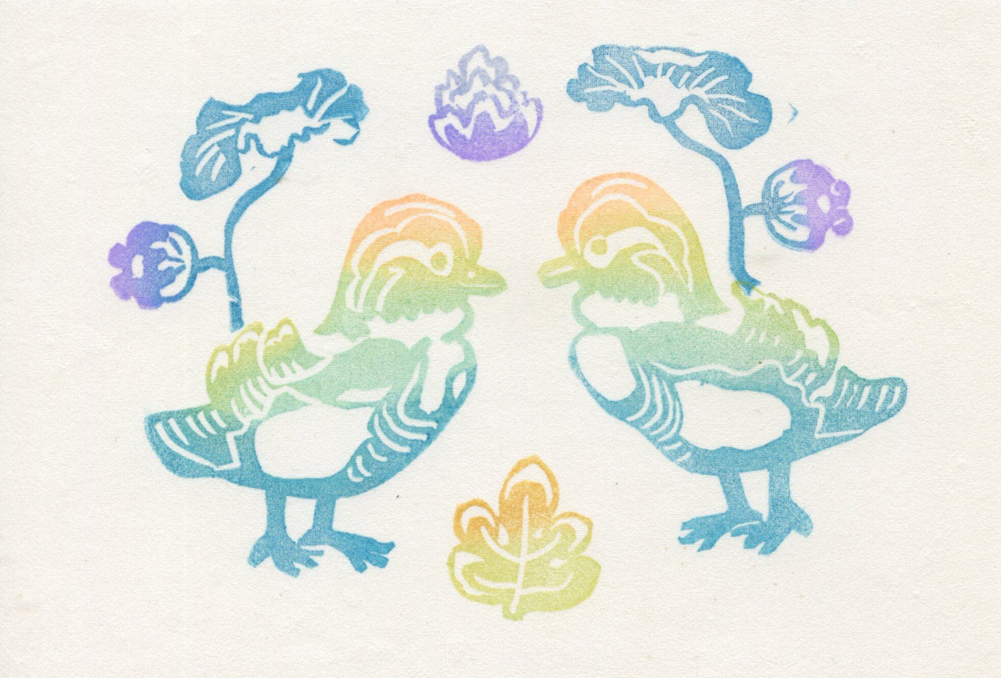 手彫りの版を用い、その時の色の重なりやかすれを大切に制作しています。印刷物では表現できない、立体感と温かみのある仕上がりです。